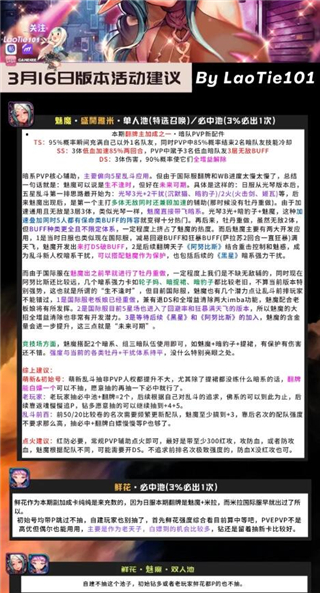 组队关键:本期要点为DOT伤害攻防,进攻测利用DOT增伤与常规控制、魅惑等,防守方利用debuff回避率/免疫、狂暴等buff。需要注意,本期增益时间减少,在角色选用上要注意buff时间,同时由于奶角色禁用,要更多侧重进攻。