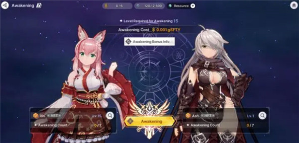 角色的成长主要分为升级和觉醒两个方面。通过不断战斗以及完成任务攒经验来获得,可提升角色表现能力,即完成角色的升级。觉醒则是达到指定等级后,通过消耗相同的另一个角色来作为材料进行的升级,觉醒会增加新的技能属性,提升角色的价值。
