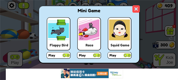 6、游戏内还有着三个独立的小游戏,可用来提升乔的心情值,还可以通过完成这些游戏来赚取金币,并用它们来购买游戏中的物品;