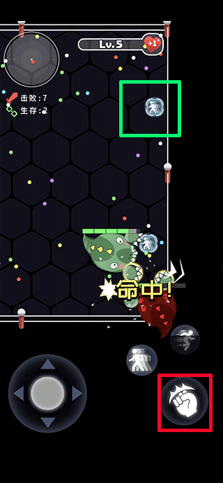 2、进游戏后红色方框内的按钮是攻击,地上经常散落着的是瞬移道具(比如绿色方框内的道具),记得捡起来。
