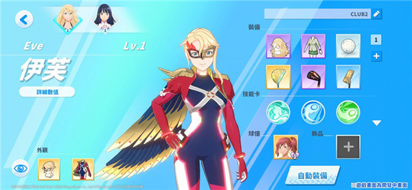 伊芙的假面衣装:和原著动画中葵的假面服装成对的衣装,以“老鹰”为设计理念。在夜晚的球场中,服装和翅膀将展现光芒