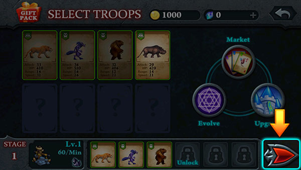 我们可以直接在商店购买高级的紫色兽王,也可以通过兽王进化,将三只兽王合成为一只更高级的兽王。另外在升级里升级矿石的获取速度能上我们更快速地召唤兽王。兽王的选择以高血高攻高速为主!合成的时候高血兽王作为头部和身体,高速兽王作为手部