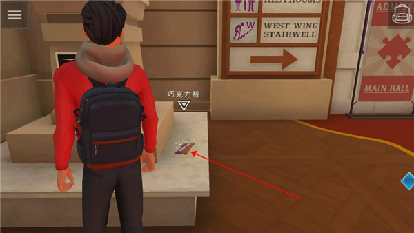 12、可以到大厅左边的柱子那里看一看,我们可以将巧克力捡起来。