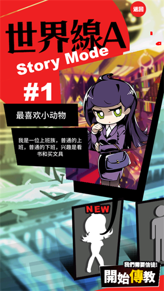 通过对传教对象的性格分析, 在不断弹出的对话中选择最能攻破他们心理防线的那一项,增加他们对有病神自在天的信仰,最终转化为神的信徒,因为在选择对话的时候是有时间限制的,所以整个游戏过程相对较为紧张,全部完成后会进入到一个需要疯狂点击画面破除目标最后心理防线的“破壁”阶段,也会有时间限制出现,在倒计时结束前点碎屏幕就可……