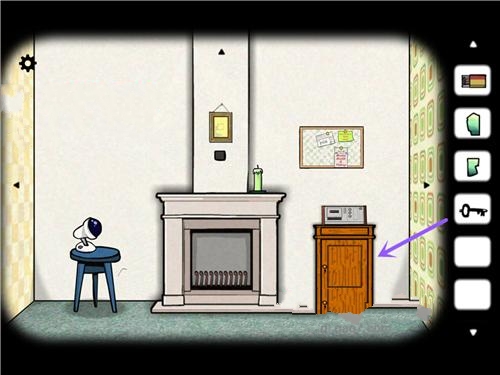 2、我们先是默认的面对有大型钟的这面,先点击盆栽柜子,在柜子抽屉里面我们能拿到火柴和勺子。接着我们点击右转镜头到另一面面对窗户的房间,打开墙上的灯泡按钮开灯,点击向上按钮,从天花板的灯罩里面取得一块相片碎片,接着回到窗户这里,再点击一次窗户,会飘出一片相片碎片。