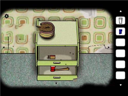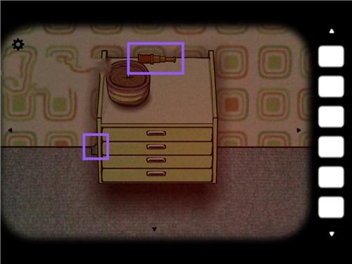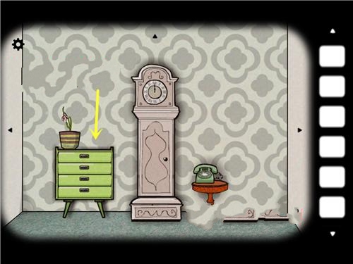 2、我们依然先是默认的面对有大型钟的这面,在盆栽柜子上拿到望远镜,然后一直点击盆栽,就发现一直手深了出来,又缩了回去,可以拿到第一篇相框碎片。抽屉里面可以取得螺丝刀,火柴,柜子边上还有一片碎片,房间钟的上方也可以取得一片碎片。