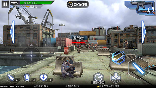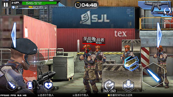 反恐特战队之卷土重来采用了滑屏控制和攻击按钮结合的方式,玩家们手指滑动屏幕左边可以控制瞄准,点击屏幕右下角的攻击按钮即可开枪射击。这种控制方式在大多数的枪战射击类手游中都得到了充分的体现,这样一来,玩家们在上手这款游戏的时候也不用消耗太多的时间去重新适应一套新的操作模式,这对于大部分玩家来说都是非常友好的。