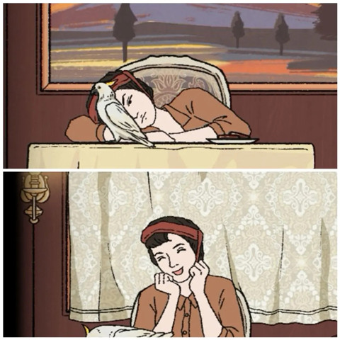 13、再回来发现她和鹦鹉背着我看窗外风景,打开她的包里面有最后的照片碎片2,并把追踪器放里面。