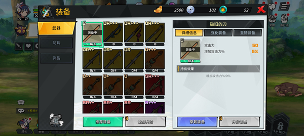 5、点击左下方装备功能,还可更换并升级武器、防具、饰品等,以此获得更加强大的实力;