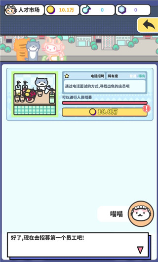 2、你可以外出去去【人才市场】或者在总部【特殊招募】聘请新的猫猫员工哦~