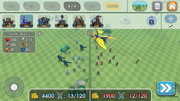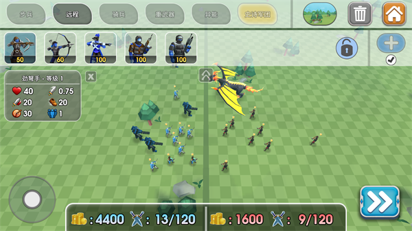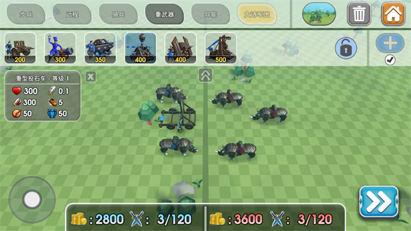 1、排兵布阵:你可以自由的选择各种士兵单位来开始战争;