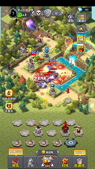 2、购买好的防御塔会出现在下方的统一的生成区域,同类且同等级的防御塔可以进行合成。