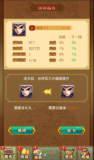 2、有些神将可以通过成长【变身】为更高级别的神将,同时获得更帅气的立绘。比如下图的甲级【常遇春】在成长变身之后可以成为圣级【猛将常遇春】。神将成长需要【功德】和【成长丸】,【成长丸】可以通过【八卦炉】炼制,并且提高【内政】等级。