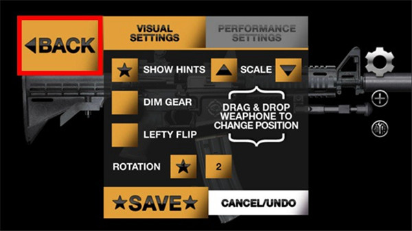 4、点击齿轮进入设置界面,这里点击BACK,可以返回枪械菜单,选择其他的枪械。