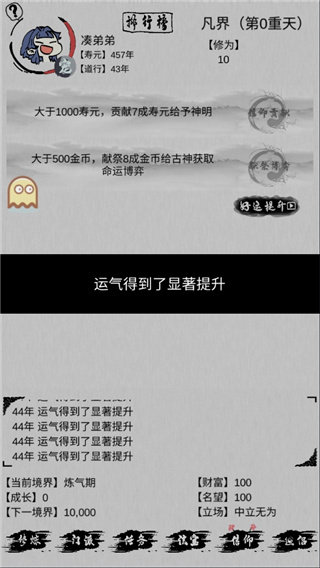 不过,游戏中的一些小细节还是需要多注意的,比如渡劫失败会损失大量修为,这让我有点紧张。还好游戏里有提供一些道具可以提升渡劫成功率,虽然效果叠加起来挺贵的。总的来说,这款游戏在玩法上很丰富,而且节奏轻松,适合像我这种喜欢休闲又不想太累的玩家。