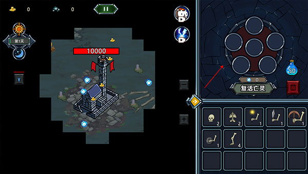 3、点击背包中的身体部位身体部位将会自动填充到相应的凹槽中,点击“复活亡灵”,复活后的亡灵会从左侧塔楼释放出来,自由去探索这片大陆并为你搜集资源,努力复活更多,组建集结你的军队。