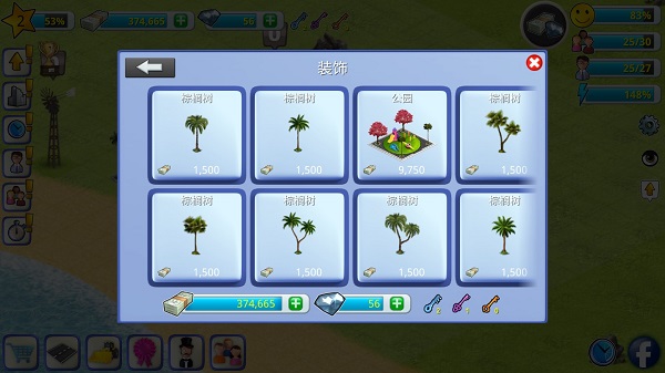 在游戏的建筑栏目中,玩家选择社区或者是装饰品,然后在里面选择要建造的建筑,在这两个大类中,每个建筑都能提高一定的快乐值。玩家如果发现屏幕中的笑脸的进度值不足100%的时候就要建造提高幸福快乐值的建筑哦。