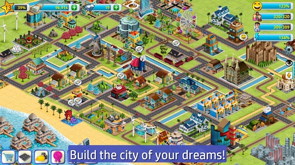 游戏里的建筑种类特别丰富,有各种各样的房子、农场、酒店甚至还有沙滩酒店和石油平台!还能解锁世界各地的地标建筑,比如摩天轮、博物馆啥的。操作起来也很直观,基本没什么难度,就是不断地盖房子、升级建筑、优化城市布局。