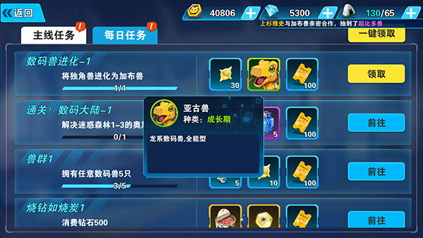 完成主线任务的目标后,可以直接领取新的数码兽。