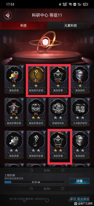 以最快的速度出要塞冲突的再来一份,点要塞冲突的时候注意超级奖励之前的科技只需要点到5,之后的全部点到10,以这种点法最快点出再来一份,记得配合科学家技能点白银多的科技,关于发展科技还有军械库也很重要,在你未来的日子里将会经常制作装备,越早点完这个科技收益越大,我的建议是先点到高级扩容,然后把军械库升到30级,那么你制造装备时间将会是最短,需要的聚变核心将是最少,如果未来你还需要进行勋章的改造,那么你再将这个科技max即可。