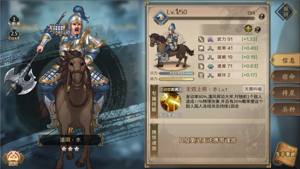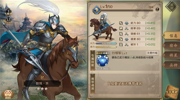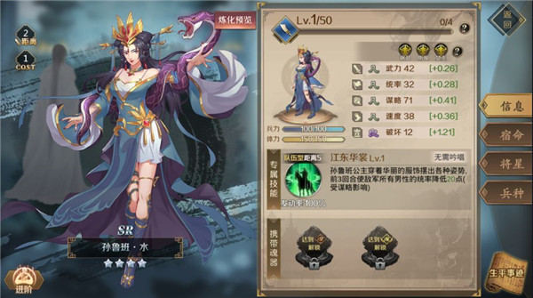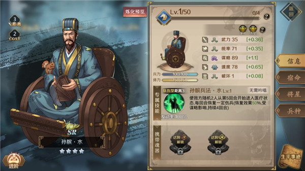 4、综合介绍:官方设定应该是孙膑坐个车,所以速度可以快点吧= =孙膑的速度成长属性一般,但是前期放在骑兵队里应该不会拖后腿了