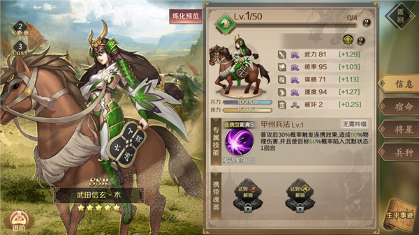 4、综合介绍:武田信玄比较难得的是,各方面属性相对平衡(除了破坏值,基本上骑兵的破坏值都不高),属性成长也比较均匀,整体看来成长前景还是很不错的。技能是连携型,无需吟唱,满级伤害160%左右,且有大概率会使目标沉默(无法发动主动技能)一回合。结合她的武力值来看,输出还是很可观的。和上杉谦信凑一起可谓强强连手