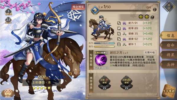 4、综合介绍:上杉谦信攻击距离3而c才2.5可以说是非常的有性价比。越早抽到,越早翻身的卡之一。谦信的技能普攻后的发动率高达100%,就看这个发动率!就问谁能不心动!造成寒冰物理伤害后也有一定几率使目标冻伤(寒冰物理伤害)且这个状态能持续2回合,怎么看怎么划算!
