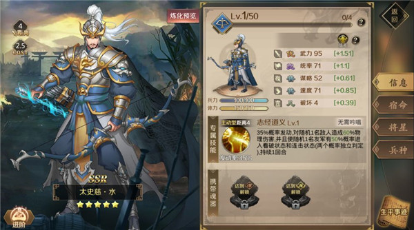 4、综合介绍:太史慈武力成长属性很不错,至少贫民窟我看来,可用。既可以打出输出又能给我方任一队友套个buff,极有可能不是一个而是2个,不过也正因为此,建议太史慈的这一队配全物理输出的阵容,物尽其用
