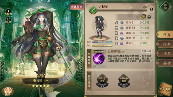 4、综合介绍:鬼谷姬c值2.5不算低,但是也是正常范围,看她的属性和成长值就能看出来,这货是个拼谋略的主。武力成长太低了,破坏值成长还行,但是有三星四星可能破坏值都比她好,速度也一般,成长也不好,所以拆迁铺路暂时都别考虑了,主要还是拼法术伤害吧