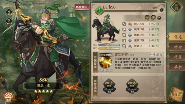 4、综合介绍:黄忠开局就送所以获取无压力,攻击距离4,c值3(不算低了),前期使用的话可能稍微有点点难,毕竟c值摆在那里,但是连起来真的不亏。对目标连续3次物理攻击,满级伤害应该在110%左右。随后还会使其进入3回合的流血状态(每回合遭到一次物理伤害),满级每回合还要遭到80%左右的物理伤害。并且这个流血状态是没有概率必然触发的,也就是说这个技能发动一次就能打一个目标6下,不香吗!