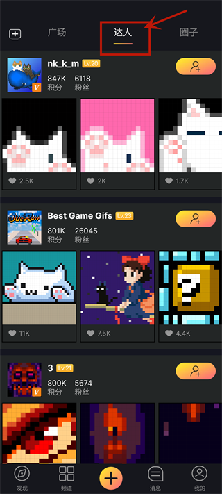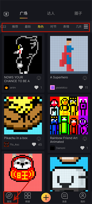 2、进入应用后,点击中间方块按钮可以查看广场的各种动态,查看别人的作品。