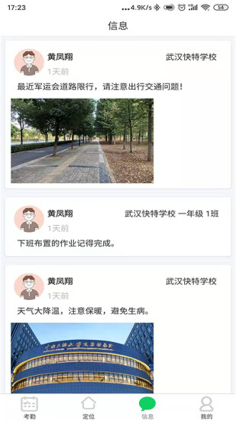 老师可发布班级通知和学校通知,支持发送文本和图片。家长可实时收到通知信息。