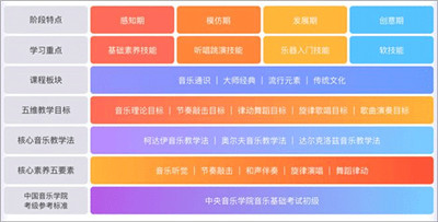 在课程板块上,咕比音乐启蒙的课程包含乐理、声乐、钢琴三大音乐核心板块,则涉及乐理、节奏、舞蹈、歌唱、演奏。从课程内容的安排来看,咕比音乐启蒙每节课针对一个知识点设计歌曲和故事;则是围绕一首曲子展开五大环节的教学,两节课精讲一首曲子。咕比音乐选择的歌曲较为经典,也有自创的儿歌,方便孩子学习跟唱,会额外选择一些摇滚乐、流行歌曲等等,可能更容易吸引孩子的兴趣。