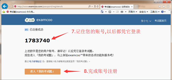7、注册成功后会看到如下图所示的提示信息。请记住你自己的账号,以后都要凭它才能登录考试酷网站。