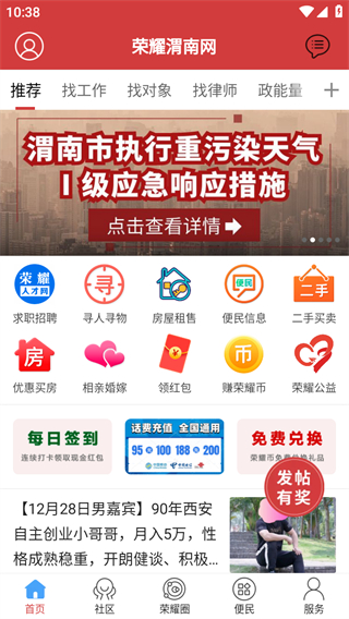首页推荐是一天的精华内容,每10分钟自动更新一次,主要内容有:渭南当地停水/停电/限行公告、突发事件、渭南本地大小趣闻、寻人寻物便民信息,粉丝福利及活动。