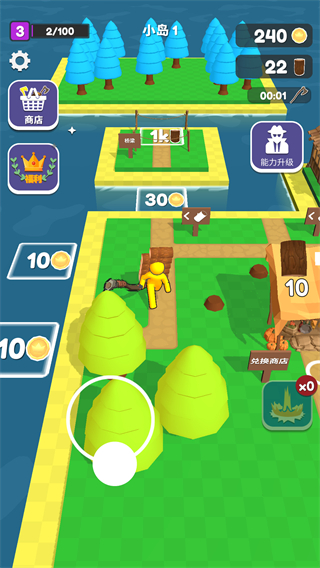1、玩家使用拇指滑动,控制小人移动,砍伐木材,扩张,探索小岛。