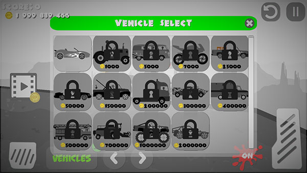 3、点击下方绿色的VEHICLES按钮,还可以更换汽车皮肤,这些皮肤需要消耗金币解锁。