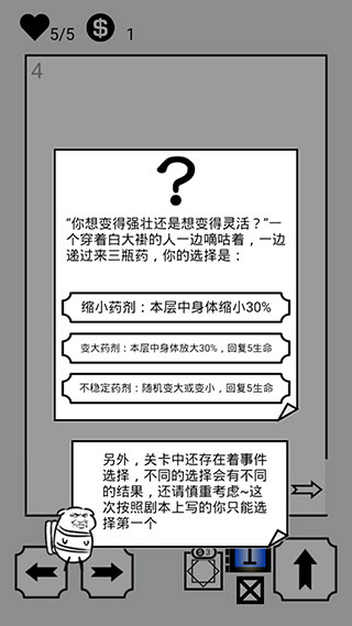 3、看来你已经掌握了一些诀窍,平时获得钥匙后左右两扇门门都会开,但因为现在是新手指引,所以得按剧本来,每层一共有5间房。