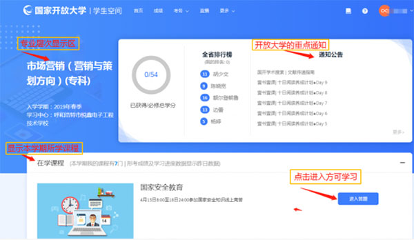 主要可以分为四个部分,它们分别是专业层次显示区、开放大学的重点通知、显示本学期所学课程、点击进入方可学习。