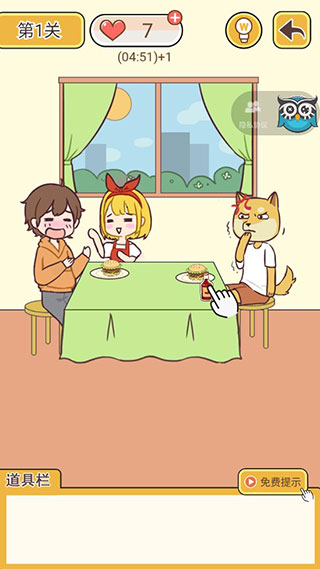 5、点击左边女孩子的手,单身狗就会牵起女孩子的手,接着点击一下头顶的灯泡,然后单身狗就会反击,说出“你看我和你女朋友才会来电”,之后就过关了。