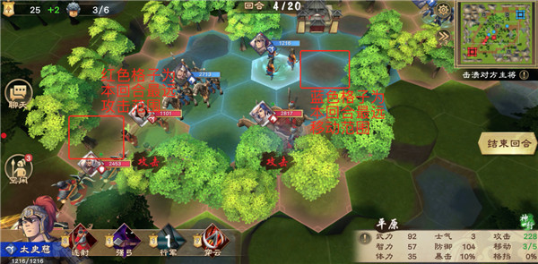 玩家指挥自己的棋子,在地图上的棋格上进行移动,武将自身移动力决定可以行动的范围