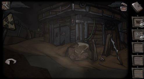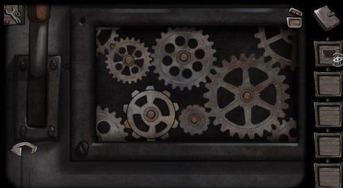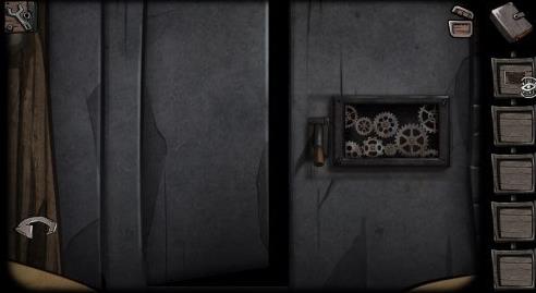 4、点击大门,走近这座房子的门口。一个齿轮装置嵌在了这看似厚重的铁门之上,齿轮装置的旁边还有着一个扳手,这个扳手应该是用于激活齿轮装置的。
