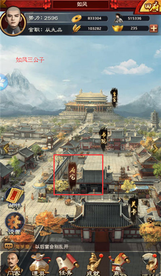 1、在游戏中玩家想要获得政绩,在游戏主页首先点击【府宅】功能。