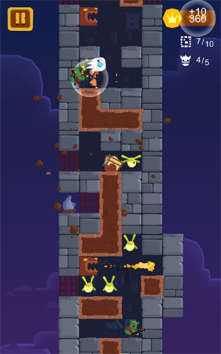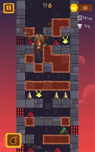 2、游戏中我们只需要向下滑动手指就可以挥动锤子向下攻击,若是土砖块则可以敲碎它们,从而到达下面的区域,不过提醒大家的是石头砖块是敲不碎的。