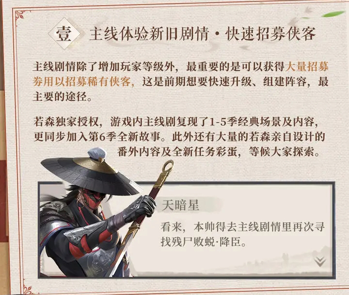 主线剧情除了增加玩家等级外,最重要的是可以获得大量招募券用以招募稀有俠客,这是前期想要快速升级、组建阵容,最主要的途径。