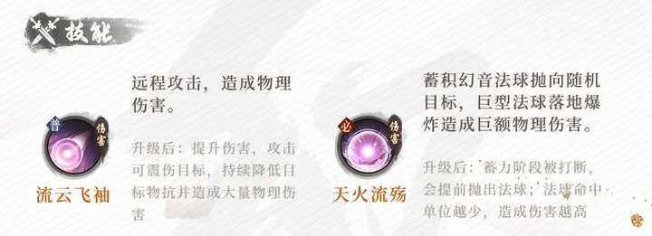 流云飞袖:远程攻击,造成物理伤害。升级后提升伤害,攻击可震伤目标,持续降低目标物抗井造成大量物理伤害。