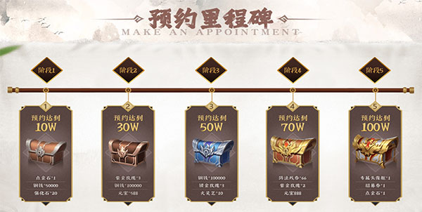 预约达到10W:点金石*1、铜钱*5w、强化石*20。