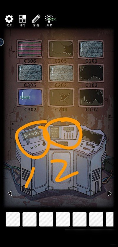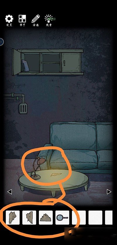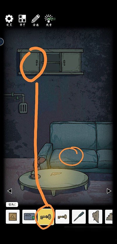 2、左转,提升沙发坐垫,获取残缺的平面图。使用钥匙c开启左侧的柜子,获取线索。