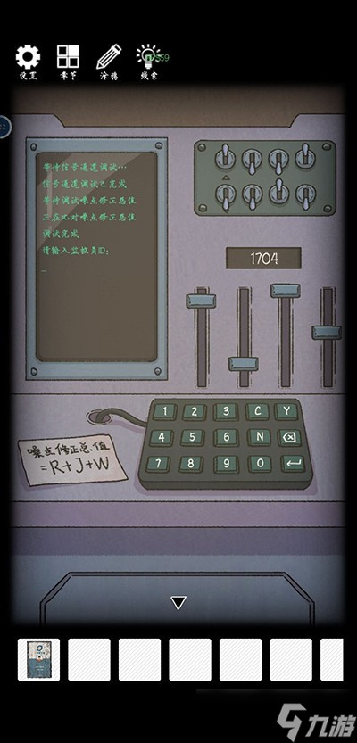 12、左转,单击左侧的操作台,调整RJW的数值。(三个按钮对应三个图形,摇杆左右调整图形位置,要求三个图形不重叠,亦不与蓝块重合,即不可有红色方块。调整完毕的数值,随后单击中间的操作台,依据风扇上的提示,转动开关,调整数值。依据工牌,录入ID及第二章中所得密码。录入Y,录入C305,即可过关。