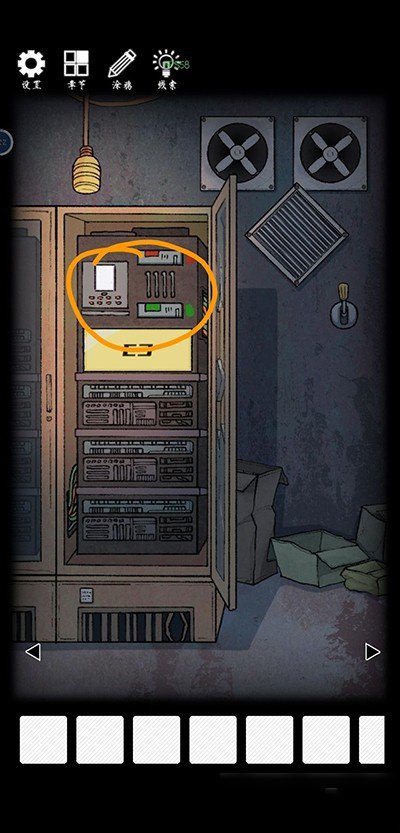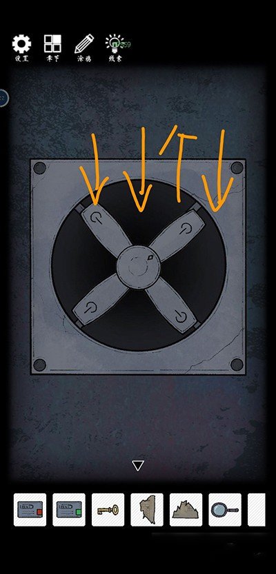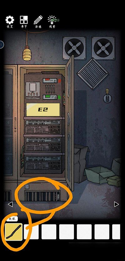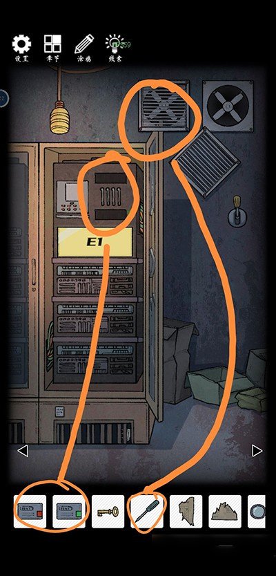 9、左转再左转,利用铁棍破拆得到开关。使用螺丝刀拆卸风扇外壳,获取线索。放置两块存储介质。